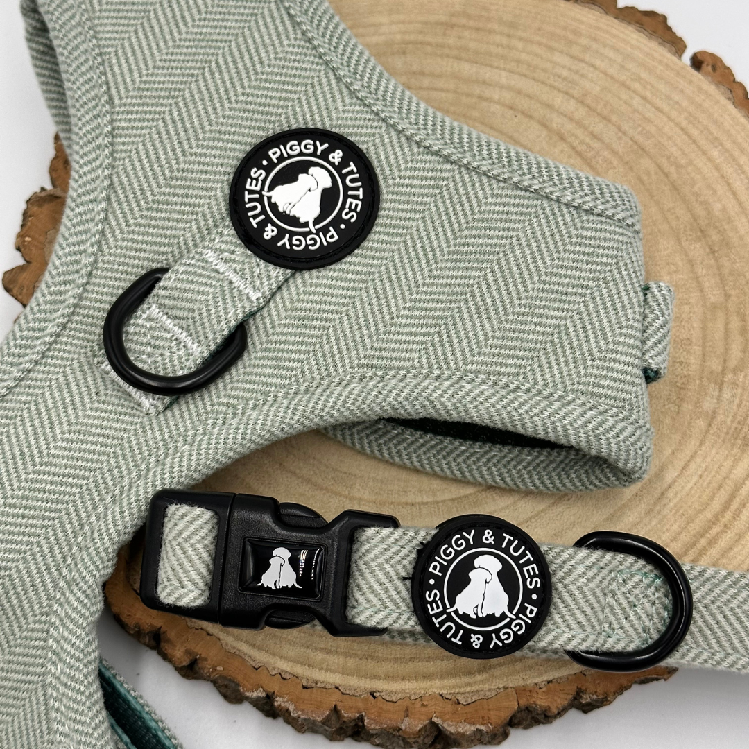 Keep your pup looking super trendy in our Piggy and Tutes Tweed Green harness!